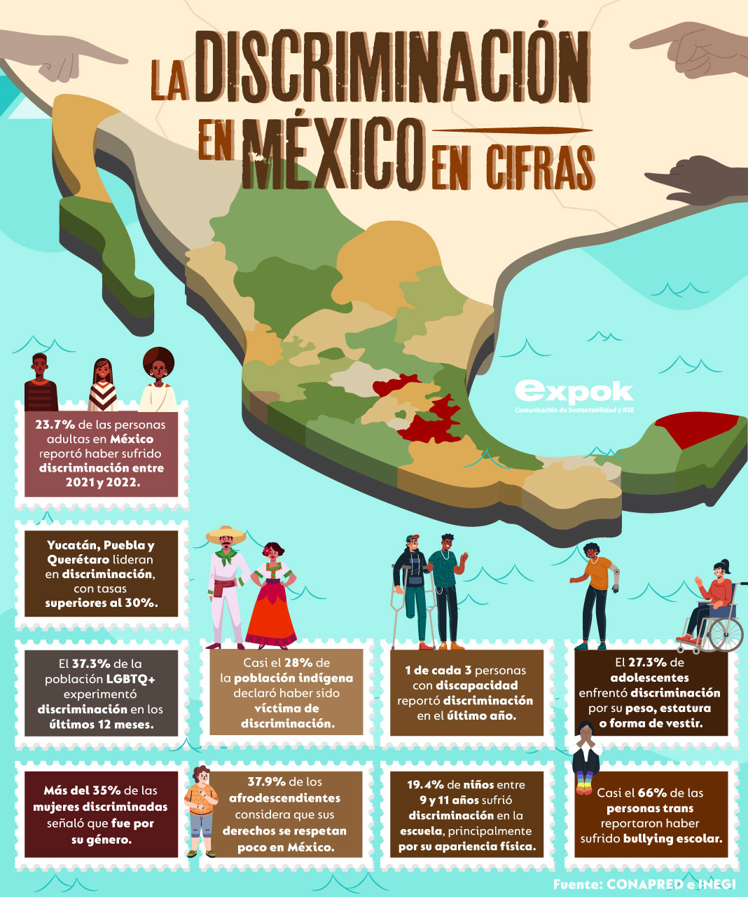 La discriminación en México continúa siendo un desafío que vulnera los derechos fundamentales de millones de personas. Grupos como las comunidades indígenas, las personas LGBTQ+ y aquellos con discapacidad enfrentan barreras sociales, económicas y culturales que limitan su desarrollo. Según la infografía, casi el 28% de la población indígena reportó ser víctima de discriminación, mientras que el 66% de las personas trans ha sufrido bullying escolar. Estas cifras reflejan una realidad alarmante que requiere acciones inmediatas y colectivas.