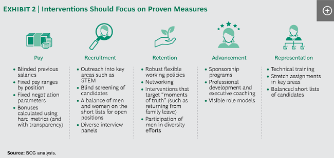 Las empresas deben establecer métricas claras y apropiadas con respecto a la contratación, retención, avance y representación de las mujeres tanto en las unidades de negocios como en las funciones de apoyo, junto con la igualdad salarial. Deben centrarse en las intervenciones correctas y medir su progreso a lo largo del tiempo.