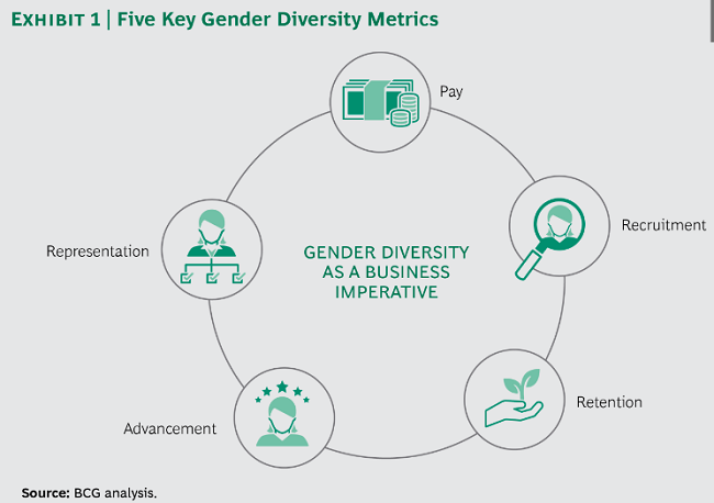 Hay cinco métricas que las organizaciones deben considerar cuando se trata de la diversidad de género: pago, reclutamiento, retención, avance y representación.