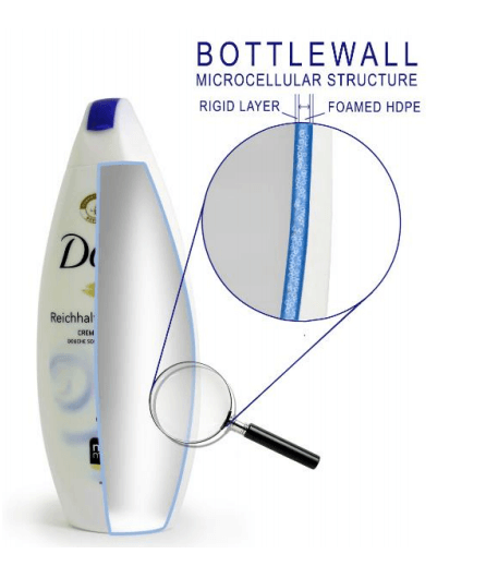 Una innovadora tecnología MuCell, que inyecta burbujas de gas en las capas intermedias de botellas de plástico, ha ayudado a reducir el peso y la cantidad de plásticos necesarios para las botellas de Dove Body Wash en un 15%.