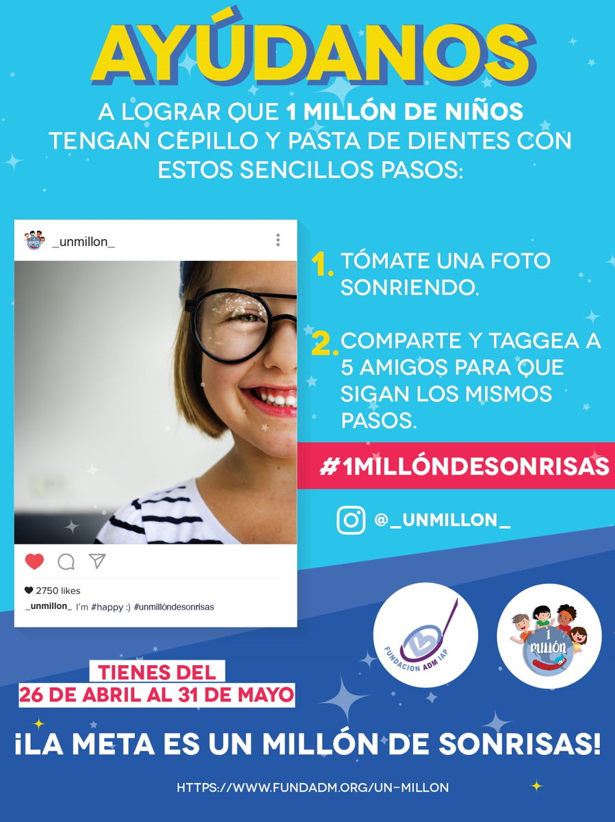 “La campaña Un Millón de Sonrisas es un reto en el que queremos que participen más de un millón de personas, apoyando a la niñez mexicana con una selfie o cazando sonrisas de amigos y subiéndolas a las redes, ya que por cada sonrisa que se suba con el hashtag #1MillóndeSonrisas, la Fundación de la Asociación Dental Mexicana, le dará a un niño un cepillo de dientes, una crema dental y le explicará cómo debe usarlo, devolviéndole su sonrisa y dándole acceso a una mejor salud bucal,” señaló el Dr. Jaime Edelson, presidente de la Fundación de la Asociación Dental Mexicana. “Otra forma de participar, es mediante un donativo, cada peso que se done es equivalente a la sonrisa de un niño, así que pueden participar también de esta manera.” Finalizó.