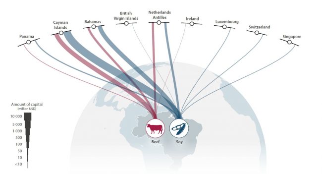 De acuerdo con un estudio, la mayoría de los pesqueros investigados tenían bandera de conveniencia. Por otro lado, una buena parte de la inversión extranjera en la ganadería y el cultivo de soja están deforestando la Amazonia y procede de paraísos como Panamá, islas Caimán o Bahamas.