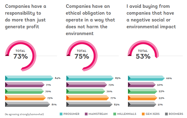 Muchos consumidores esperan que las empresas muestren un nivel de responsabilidad social empresarial (RSE). En 2016, el informe Havas Worldwide Project: Superbrand, que encuestó a 10,131 personas de 18 años y más en 28 mercados de todo el mundo, reveló que el 73% dijo que las empresas tienen la responsabilidad de hacer algo más que generar ganancias, mientras que el 75% cree que las marcas tienen la obligación de operar de una manera que no dañe el medio ambiente. Los encuestados incluyeron millennials, Gen Xers y baby boomers.
