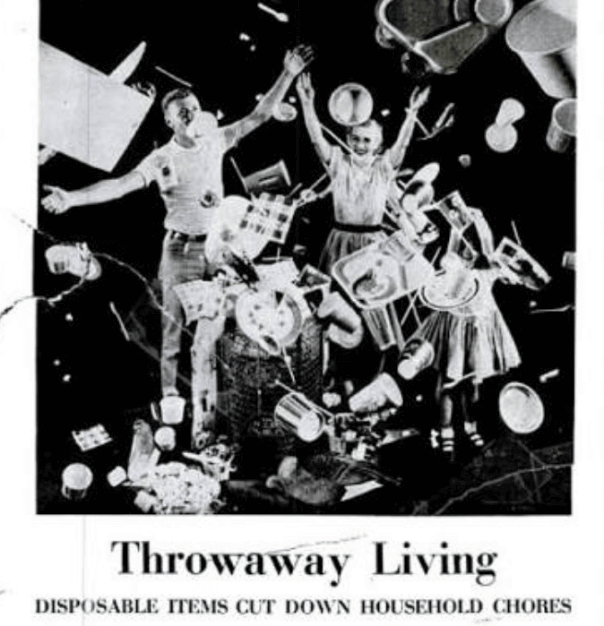 En una famosa portada de The Time de 1955, una familia está de pie frente a un bote de basura, platos de plástico desechables, tenedores y pajitas en el aire como confeti, junto con el titular “Throwaway Living” (Vida desechable).
