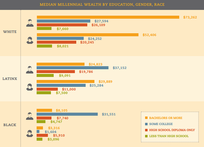 Las mujeres millennials se gradúan con un promedio de 20.263 dólares deuda estudiantil. La deuda es especialmente onerosa para las estudiantes negras y latinas y, por lo tanto, pueden acceder a menos apoyo financiero de sus padres que de sus compañeros blancos.