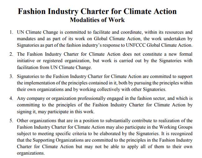 El documento describe 16 principios clave para los signatarios, incluida una cláusula que exige que las empresas participantes reduzcan su huella de carbono en un 30% para 2030.