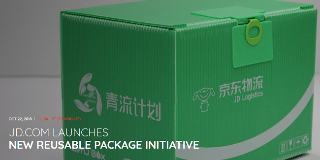 Como parte de la iniciativa, JD utilizó 100,000 “cajas verdes” reciclables para entregar productos en 2017. Estas cajas son contenedores de empaque reutilizables hechos de lo que JD describe como resina termoplástica fuerte pero liviana. Un representante de la compañía explicó que este material permite reutilizar las cajas con mayor frecuencia y eficiencia, reduciendo el uso general de papel y la huella de carbono de la empresa.