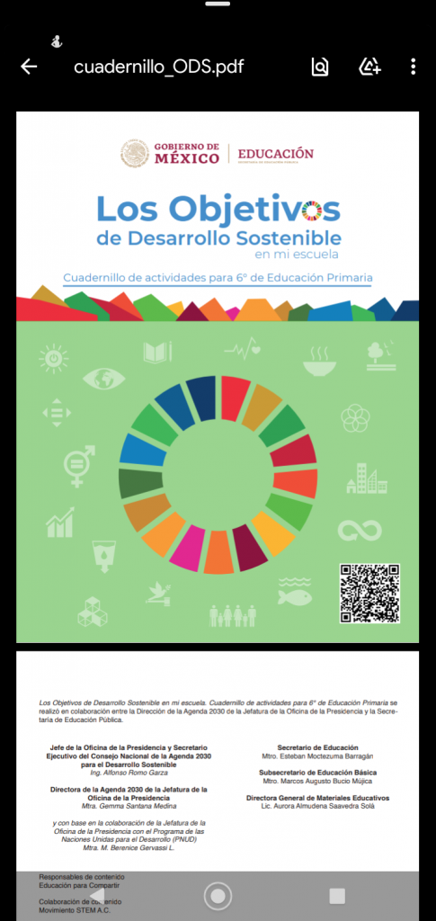 Este cuadernillo llamado: Los Objetivos de Desarrollo Sostenible en mi escuela, hecho con base en el plan de estudios de sexto grado de primaria, puede ser leído por todas las personas que estén interesadas en él, ya que es gratis en internet y Santana invitó a descargarlo, concluyendo con que ésto sólo es una pequeña acción de lo que hacen para seguir impulsando la Agenda 2030.