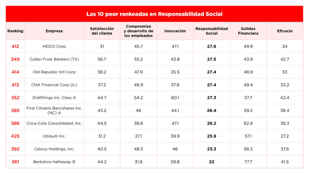 El ranking no busca penalizar a las empresas con menor puntaje en una categoría, sino identificar aquellas que logran equilibrar múltiples dimensiones de efectividad. La responsabilidad social es solo una de ellas. Dicho esto, estos son los puntajes más bajos: