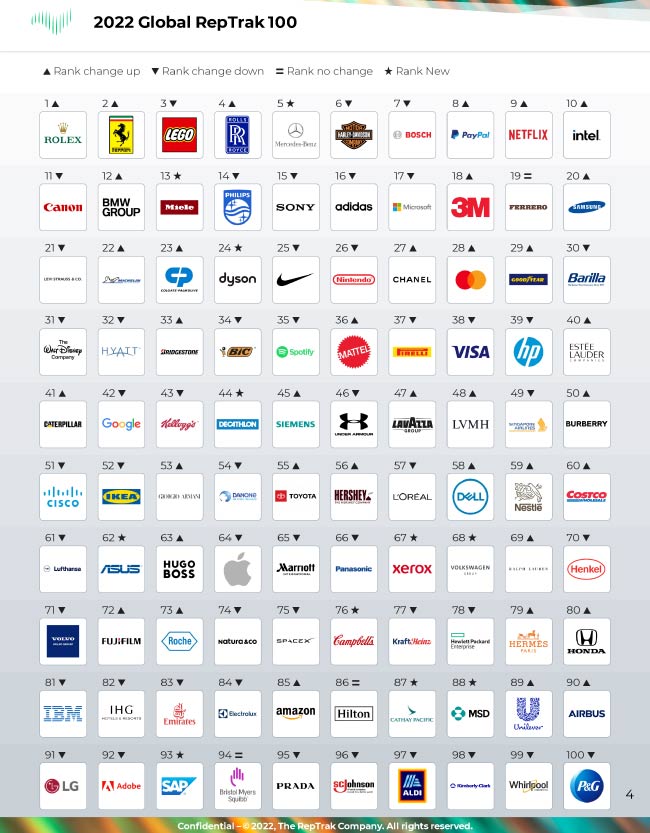 El caso de Rolex —empresa suiza de relojes de pulsera de lujo y accesorios— es emblemático, ya que es la quinta ocasión que ocupa el primer lugar y la novena en ubicarse entre 10 primeros en el Global RepTrak.