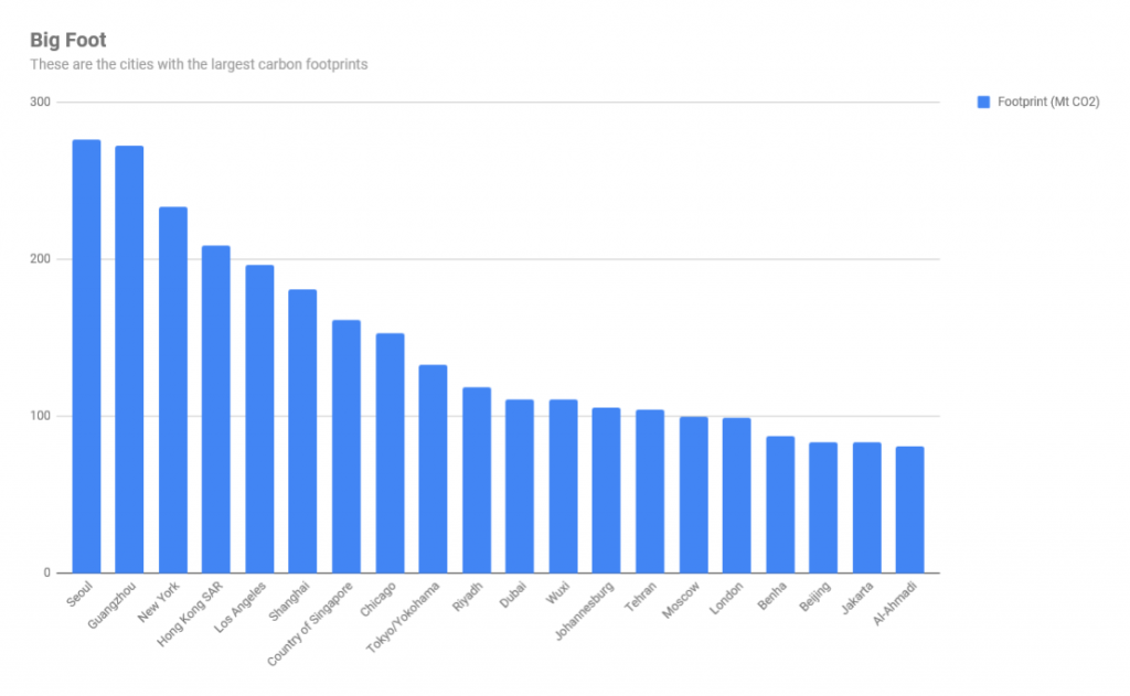 La ciudad que encabeza la lista de huellas de carbono es Seúl en Corea del Sur con 13 mil ciudades; le sigue Guangzhou en China, con una población de 14 millones y en tercer lugar se encuentra la ciudad de Nueva York.