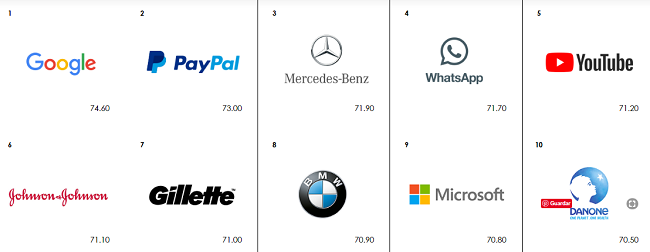 - Google, PayPal, Gillette y Johnson & Johnson se encuentran en las diez primeras clasificaciones de marcas más significativas del 2019.