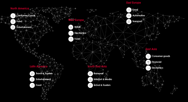 Comparado con alimentos, automóviles y transporte en Europa del Este y bienes de consumo, alimentos y entretenimiento en América del Norte.