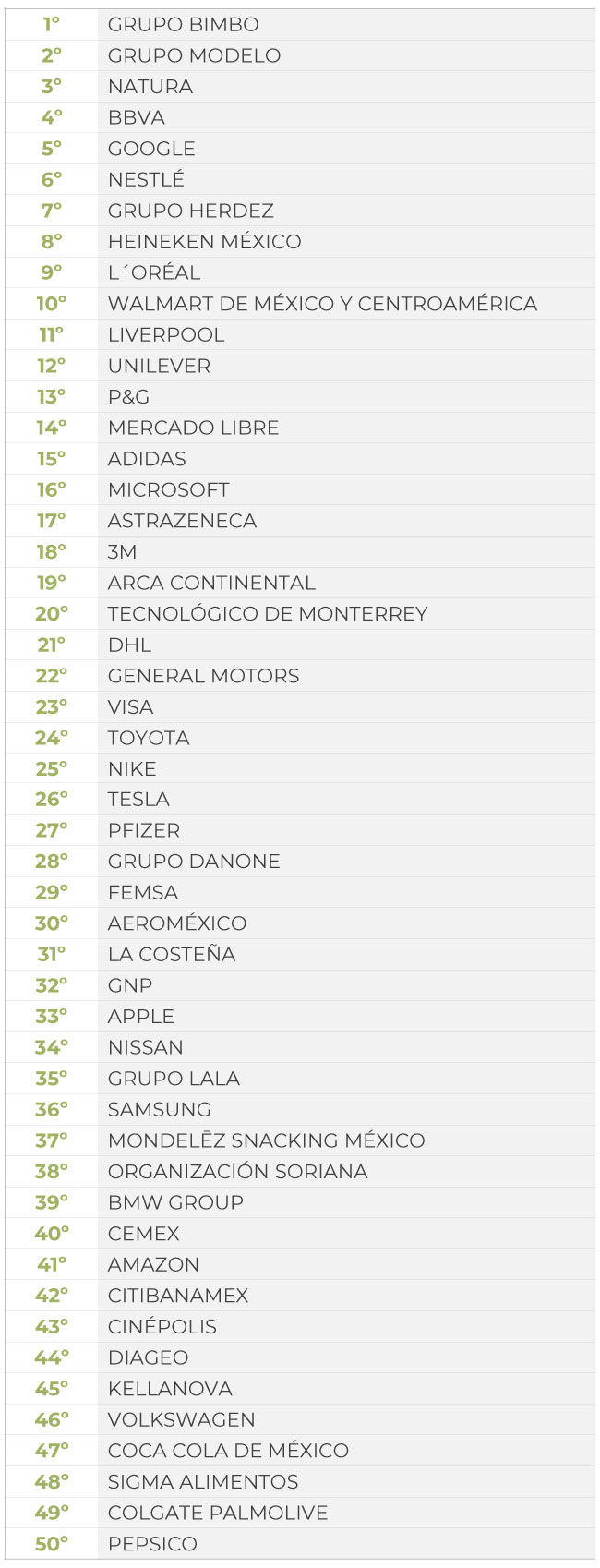 Grupo Bimbo es la empresa más responsable con el medioambiente, seguida de Grupo Modelo (2º), Natura (3º), BBVA (4º), Google (5º), Nestlé (6º), Grupo Herdez (7º), Heineken México (8º), L’Oreal (9º) y Walmart de México y Centroamérica (10º).
