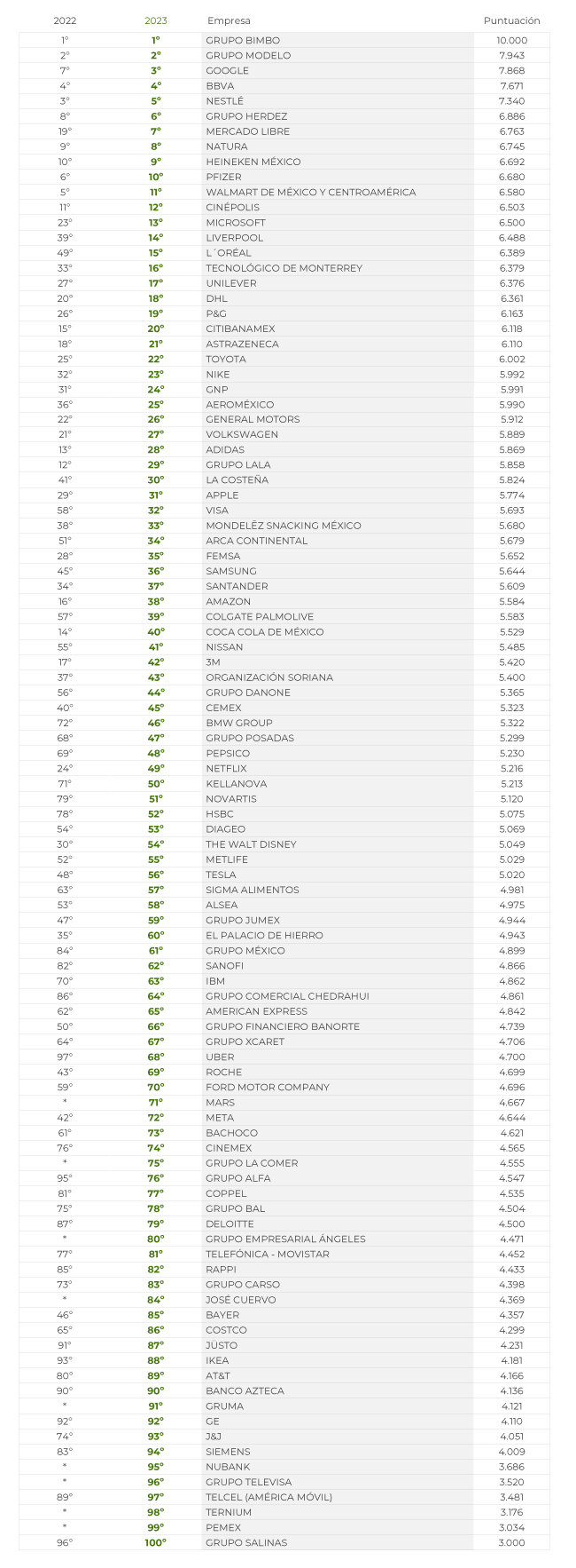 Grupo Bimbo y Grupo Modelo son nuevamente las empresas más responsables en términos ESG de México en 2023. Le siguen Google (3º), BBVA (4º), Nestlé (5º), Grupo Herdez (6º), Mercado Libre (7º), Natura (8º), Heineken México (9º) y Pfizer (10º).