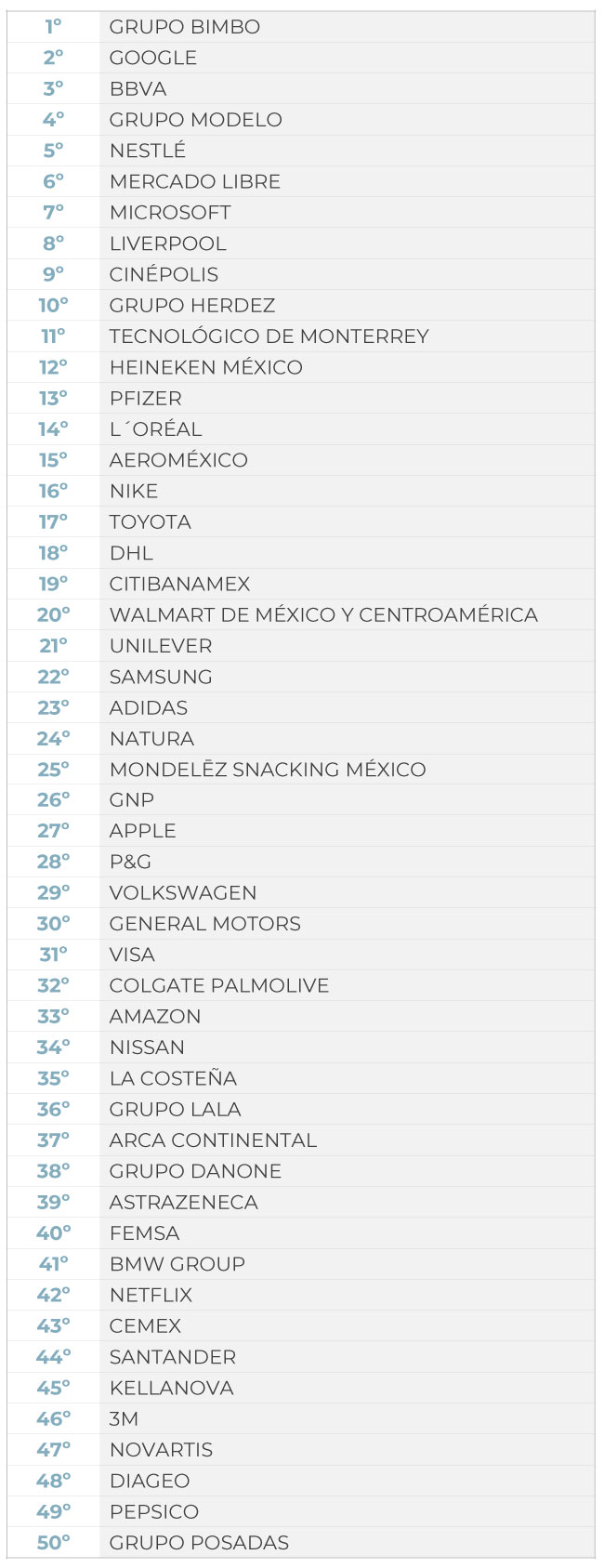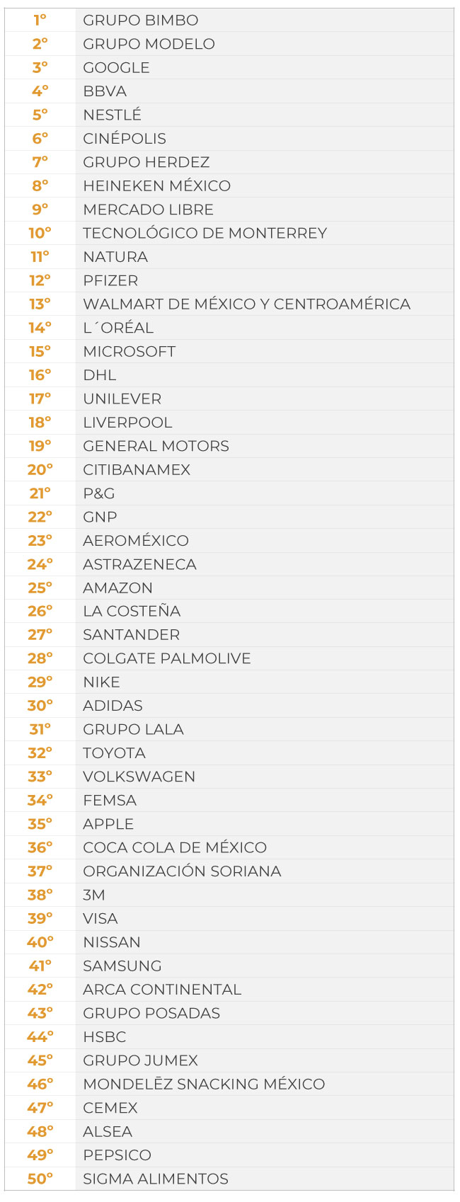 A su vez, Grupo Bimbo es la empresa más responsable en el ámbito interno, con los clientes y la sociedad. Grupo Modelo (2º), Google (3º), BBVA (4º), Nestlé (5º), Cinépolis (6º), Grupo Herdez (7º), Heineken México (8º), Mercado Libre (9º) y Tecnológico de Monterrey (10º) completan el top 10.