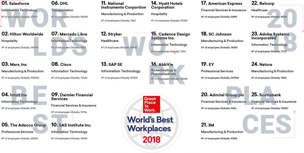 La consultora realizó un análisis a 7 mil organizaciones y a sus más de 12 millones de empleados en 58 países para desarrollar este ranking mundial. Se trata de la octava edición de la Lista Mundial, que reconoce a las empresas como Word’s Best Workplaces por sus esfuerzos diarios para crear lugares de trabajo donde cualquier empleado pueda maximizar las tareas que realiza dentro la organización.