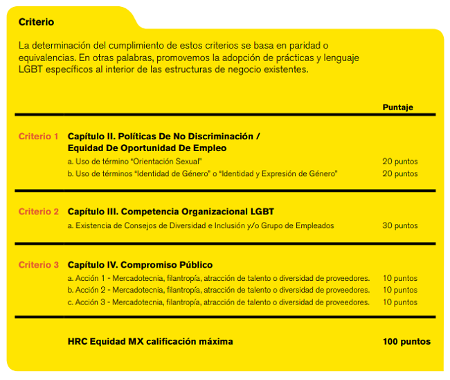 Los criterios establecidos para evaluar el desempeño y compromiso de los empleadores participantes, está basado en la experiencia de la implementación del Corporate Equality Index (CEI por sus siglas en inglés). El CEI fue lanzado en el 2002 y desde entonces se ha covertido en la primera herramienta de evaluación comparativa, reconocida a nivel internacional que permite a las empresas evaluar su nivel de inclusión LGBT en el espacio laboral contra competidores.