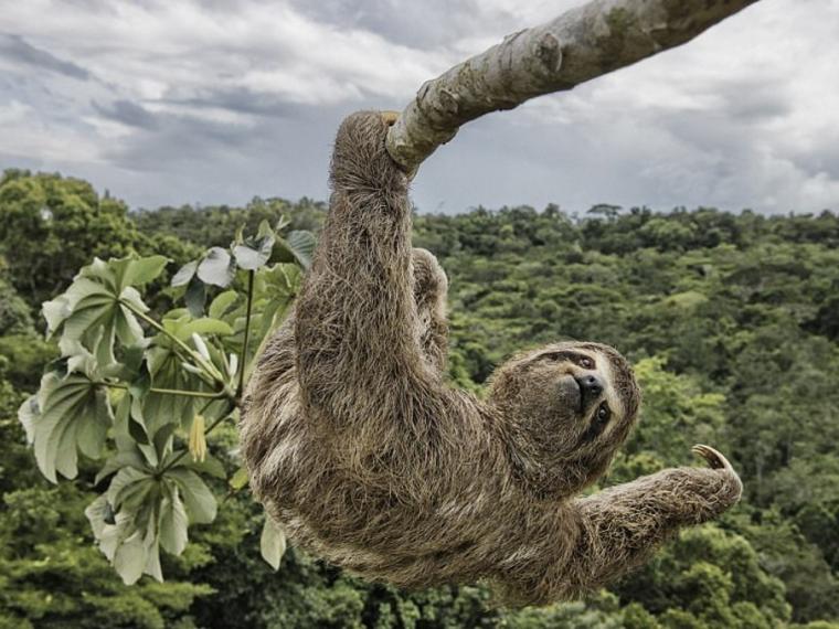 Esta divertida toma, fue lograda por Luciano Candisani de Brasil, quien tuvo que escalar el árbol de cecropia para poder tomarla a nivel de los ojos de este perezoso de tres dedos. El árbol de cecropia es la comida favorita de estos mamíferos.