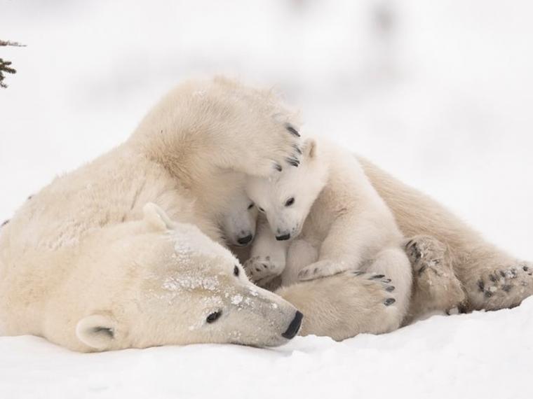 Esta tierna fotografía fue captada en el Parque Nacional Wapusk, Manitoba en Canadá por la fotógrafa Debra Garside. Para poder lograrla ella esperó seis días, temperaturas de -55ºC para lograr este momento conmovedor entre una mamá osa polar y su hijo.
