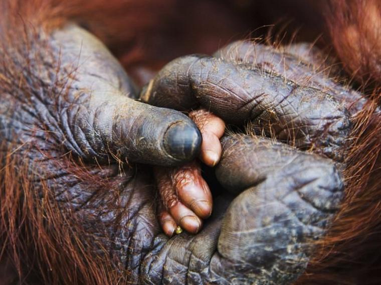 En la imagen se puede distinguir una mano grande con una pequeña, símbolo de crianza y cuidado. Se trata de un bebé orangután y la mano de su madre. Esta foto fue realizada por Jami Tarris de Reino Unido, en Borneo, Indonesia.