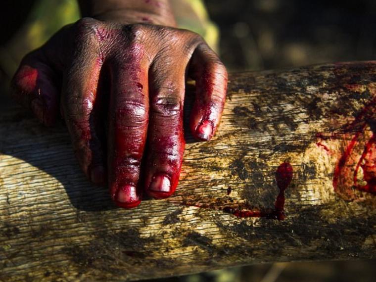 Peter Chadwick, tomó esta imagen en un área protegida de Zululand, Sudáfrica. En el centro se puede ver una mano de un guardabosque que descansa sobre un colmillo de marfil muy grueso, que está cubierto por la sangre de un elefante africano que recibió un disparo.
