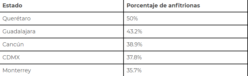 En cuanto a las Experiencias, actividades que pueden ser reservadas a través la plataforma permitiendo experimentar un lado diferente de la ciudad al viajar, el top 5 de estados con mayor porcentaje de anfitrionas son: