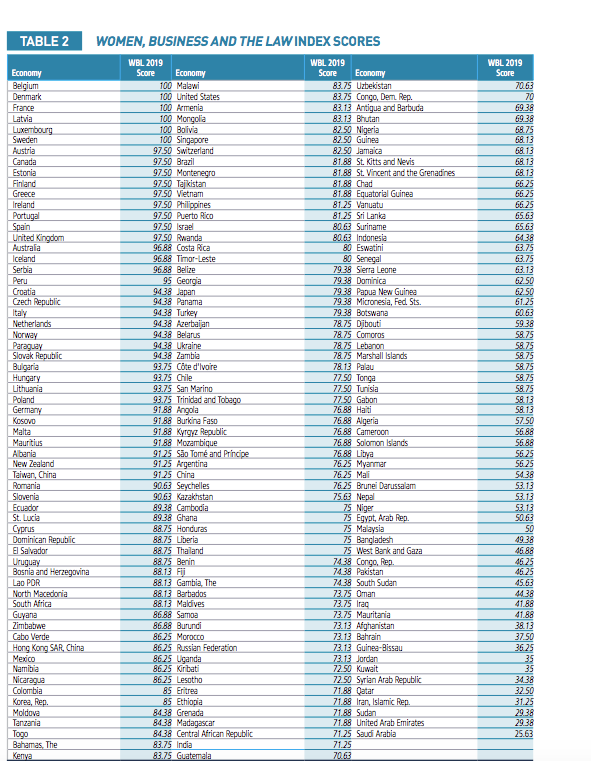 De acuerdo con un informe del Banco Mundial existe una lista de países donde se imparten leyes de matrimonio, empleo, viajes con igualdad de género. En total son seis países los que otorgan derechos equitativos para hombres y mujeres.