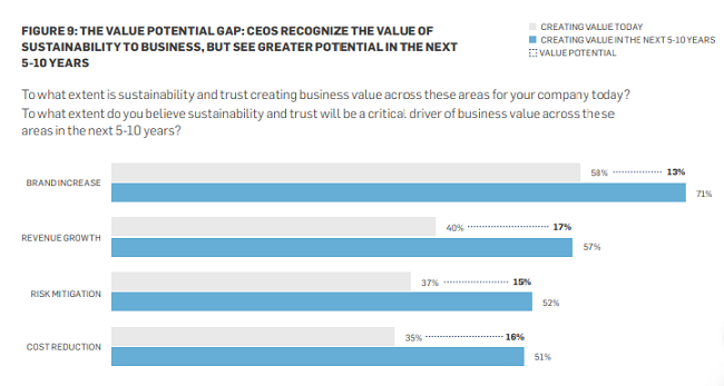 - Solo el 26% de los CEO en 2019 dijo que no hay un vínculo claro con el valor comercial como una barrera para la sostenibilidad en comparación con el 31% en 2016 y el 37% en 2013.