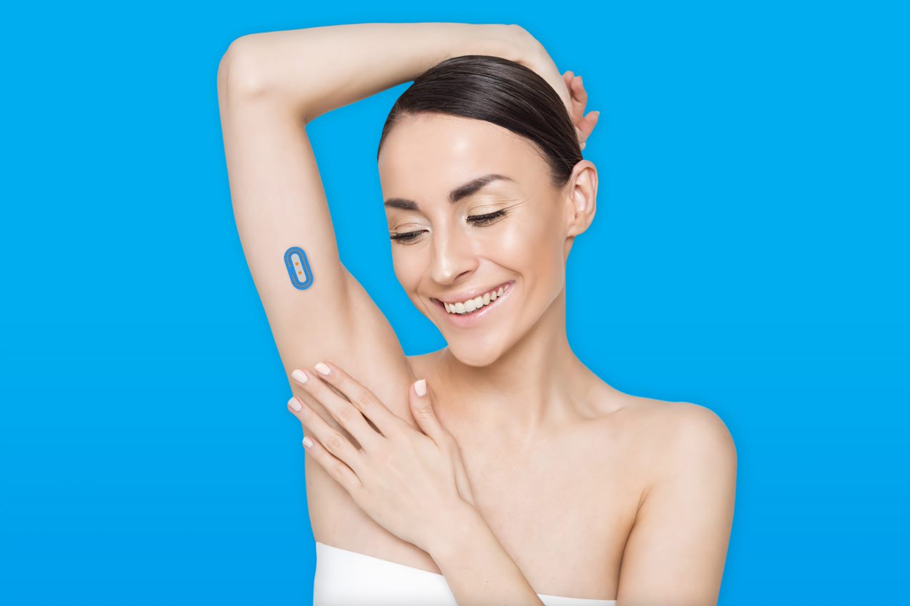 1) El usuario coloca el sensor en la parte interna de su brazo y lo deja ahí durante 5 a 15 minutos—hasta que los dos puntos del centro se coloreen.