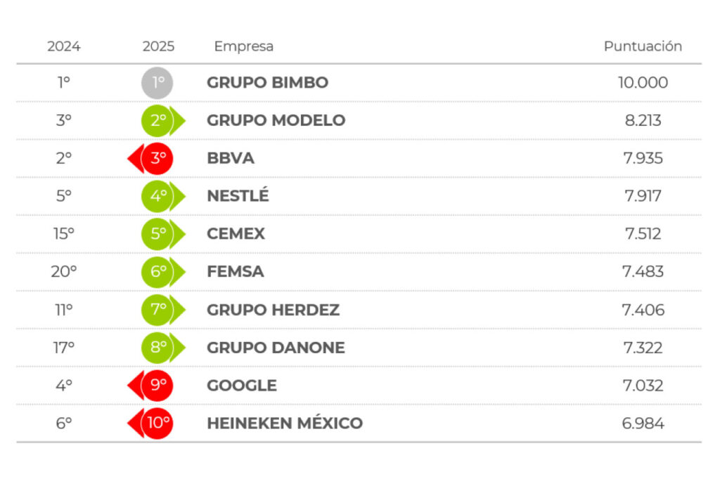 Las que han sobresalido en su responsabilidad a nivel ético y de gobernanza son por orden Grupo Bimbo (1º), BBVA (2º), Grupo Modelo (3º), Nestlé (4º), Cemex (5º), Grupo Danone (6º), Liverpool (7º), Grupo Herdez (8º), Femsa (9º) y Cinépolis (10º).