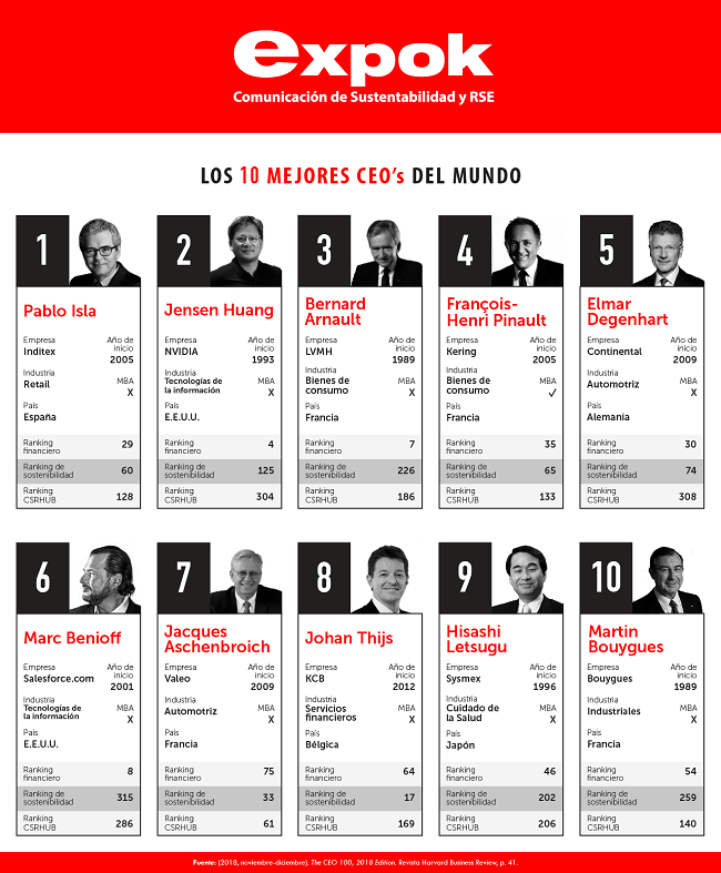 En tiempos turbulentos, la estabilidad puede ser virtud significativa. Estas cualidades son evidentes en los 100 hombres y mujeres que han logrado un puesto en el ranking de HBR en 2018 de los CEOs con el mejor desempeño del mundo. Enfrentan una gran variedad de fuerzas externas: competidores inteligentes, clientes exigentes, inversionistas que buscan obtener ganancias. No obstante, sus compañías han demostrado una notable capacidad para mantener el impulso: setenta de los 100 líderes en el ranking del año pasado tuvieron un desempeño lo suficientemente bueno como para volver a lograr la distinción este año, incluido Pablo Isla, del gigante español de venta rápida Inditex, que repite como el ejecutivo número uno.