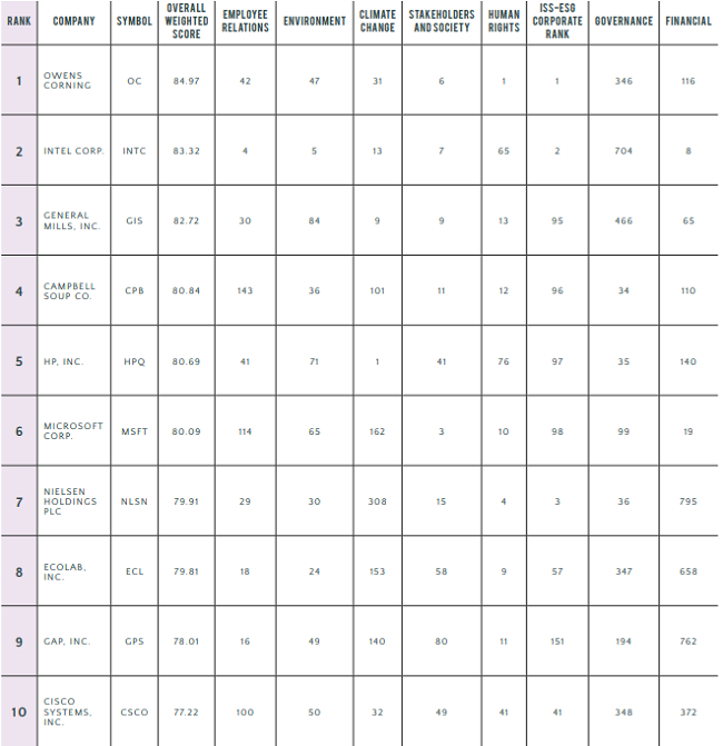 Owens Corning encabeza el ranking de 100 mejores ciudadanos corporativos, seguido por Intel, General Mills, Campbell Soup y HP Inc.