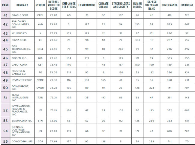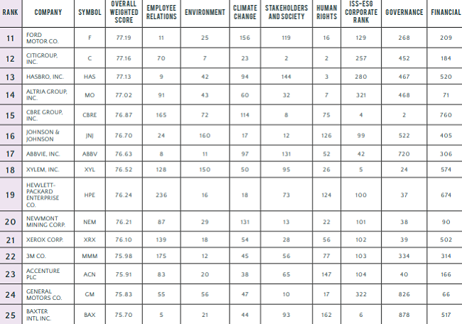 Los 100 mejores ciudadanos corporativos clasifican el índice Russell 1000 y la investigación es realizada por ISS-ESG, el brazo responsable de investigación de inversiones de Institutional Shareholder Services. No hay tarifa para que las empresas sean evaluadas.