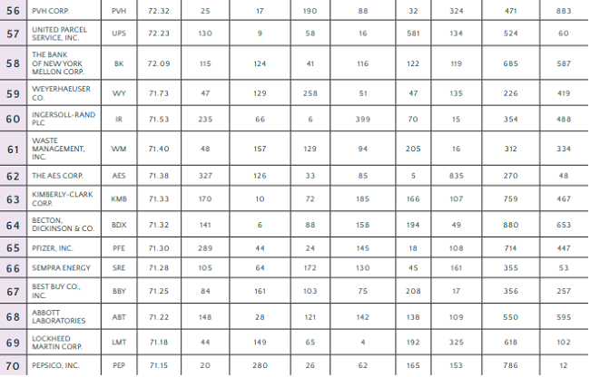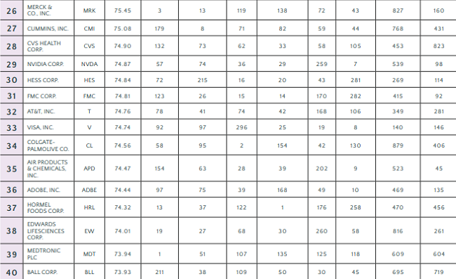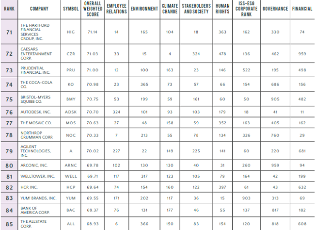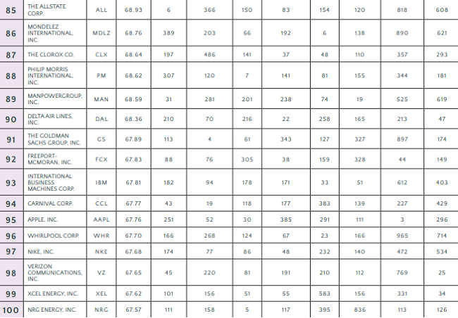 Veintisiete compañías son nuevas en el ranking en 2019, incluidas Allstate, Delta Airlines y Mondelez International. Los mayores ganadores incluyen Ball Corp., CBRE, Ford y Xylem, Inc.