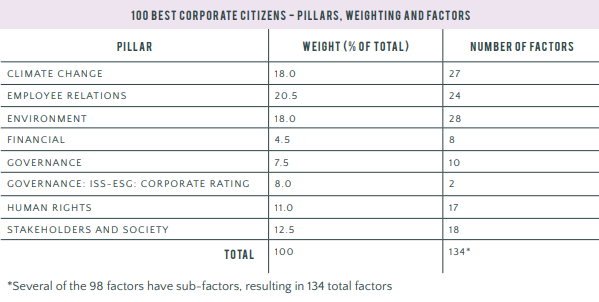 La clasificación de los 100 mejores ciudadanos corporativos utiliza 134 factores de rendimiento y divulgación corporativa en siete categorías: