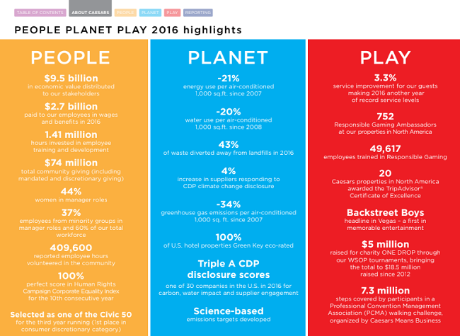 El último reporte de RSE de Caesars describe sus impactos en las economías locales, las personas, la sociedad y el medio ambiente. People Planet Play es la forma en que la marca se refiere a cómo hace una diferencia positiva en la sociedad. Los planes y programas de ciudadanía existentes y fuertemente enraizados en su misión, visión y valores como compañía, así como su Código de Compromiso y People Planet Play, son un nuevo lenguaje para Caesars que expresa de manera simple y clara sus creencias.