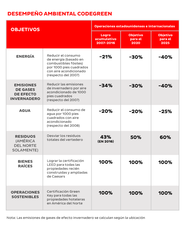 La estrategia de carbono y gestión desarrollada por Caesars es un concepto básico del programa ambiental CodeGreen de la compañía, que se estableció en 2008 e involucra a los colaboradores y huéspedes para comprender y disminuir el uso de energía, emisiones GEI, residuos y uso del agua. Caesars Entertainment ha reducido sus emisiones totales de GEI en un 22.9% desde el 2011.