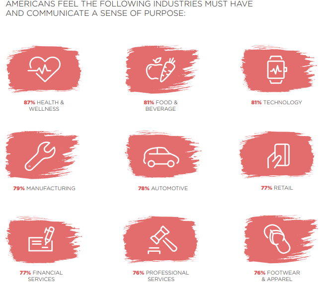 Ninguna industria parece estar exenta, tampoco. Cuando se le preguntó a qué industrias era más importante tener y comunicar un sentido de propósito, la salud y el bienestar (87 por ciento) encabezaron la lista, seguidos de los alimentos y bebidas (81 por ciento) y la tecnología (81 por ciento). Sin embargo, más de tres cuartos también creen que es importante para industrias tales como manufactura (79 por ciento), automotriz (78 por ciento), comercio minorista (77 por ciento), servicios financieros (77 por ciento), servicios profesionales (76 por ciento) y calzado y ropa (76 por ciento).