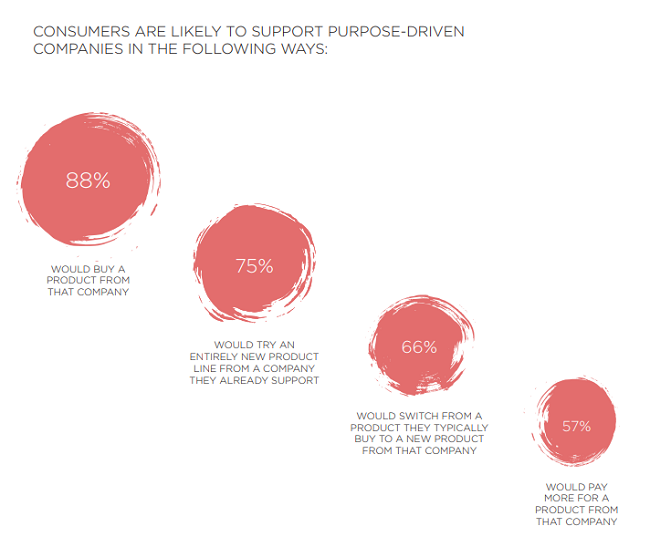 Casi ocho de cada diez (79 por ciento) dicen que son más leales a las empresas con propósitos específicos y les dirían a otros que compren productos de esas compañías (78 por ciento), mientras que dos tercios (66 por ciento) dicen que cambiarían de marca y más de la mitad (57 por ciento) pagaría más.