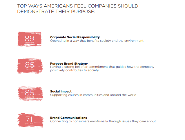 El estudio realizó encuestas a más de 1,000 estadounidenses mayores de 20 años acerca de sus expectativas y comportamientos hacia empresas con propósito en comparación con las marcas tradicionales.