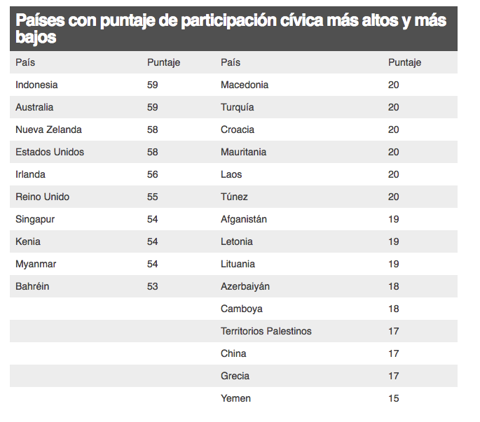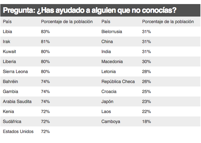 Fueron más de 150 personas en 146 países los que fueron entrevistadas por Gallup en 2017. Se les preguntó si habían donado dinero o habían sido voluntarios en organizaciones benéficas, o si habían ayudado a algún extraño el mes anterior.