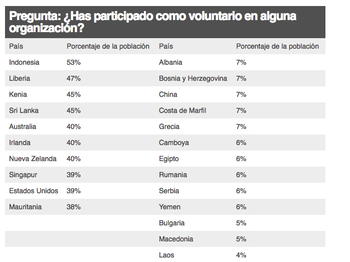 Sin embargo, la ayuda no depende de si tienen más ingresos o no. Por ejemplo, los indonesios hacen el doble de trabajo voluntario que los alemanes, a pesar de que en Indonesia se tiene una de las jornadas laborales más largas del mundo y en Alemania es una de las más cortas