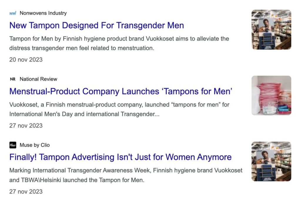 Un claro ejemplo de esta nueva realidad es lo realizado en Finalndia por Vuokkoset, productos para el período menstrual destinados específicamente a hombres transgénero.