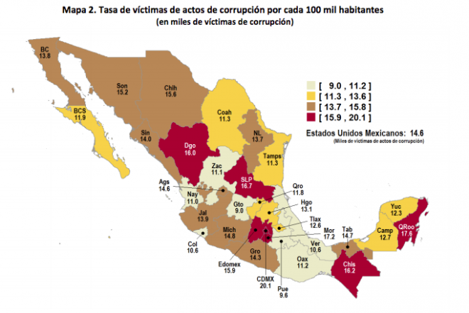 De acuerdo con datos de El Universal, los estados de la República Mexicana, donde se tiene la mayor tasa de prevalencia en materia de corrupción son: