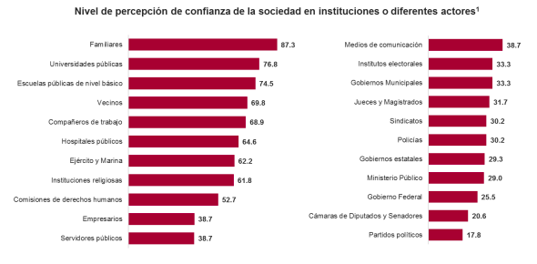 Las instituciones que menos confianza generan entre los mexicanos son el Gobierno Federal, la Cámara de diputados y el Senado de la República, hasta el último lugar, los partidos políticos.
