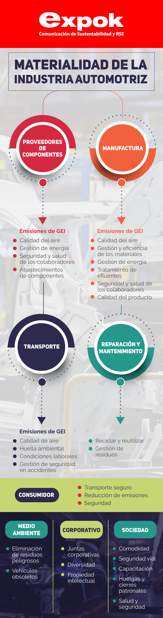 Además, la materialidad de la industria automotriz, involucra desde los componentes para fabricación, proveedores, transporte, seguridad e incluso calidad del aire e impacto ambiental, que son piezas claves que las marcas de la industria automotriz tienen que cuidar y mejorar.