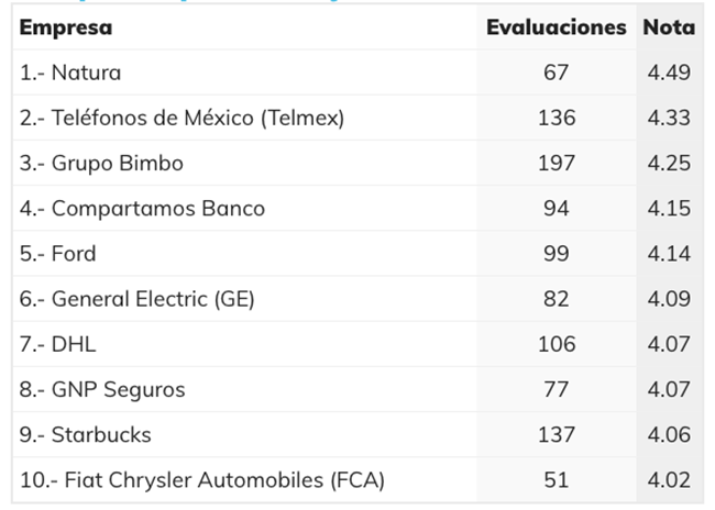 Grupo Bimbo, Banco Compartamos y Ford completan el top cinco. Todas con evaluaciones arriba de los 4.1 puntos.