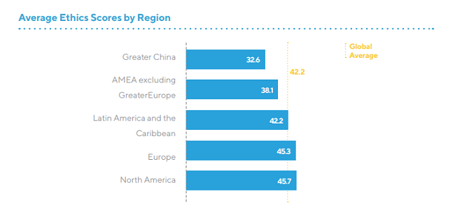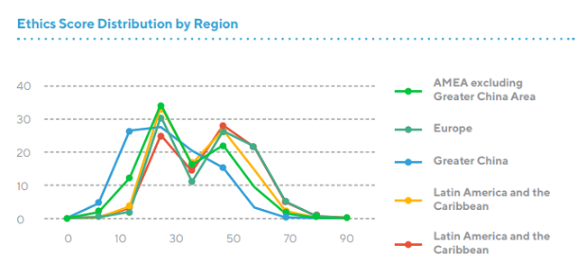 • Las compañías norteamericanas y europeas están liderando el mundo en ética empresarial con puntajes superiores a 45, lo que indica que son las más proactivas y estructuradas cuando se trata de asuntos de ética empresarial. El 56 por ciento de las compañías en América del Norte y el 51 por ciento en Europa tienen una política formal sobre la corrupción, probablemente debido a los respectivos entornos regulatorios que conllevan un mayor escrutinio, obligaciones de divulgación y sanciones.