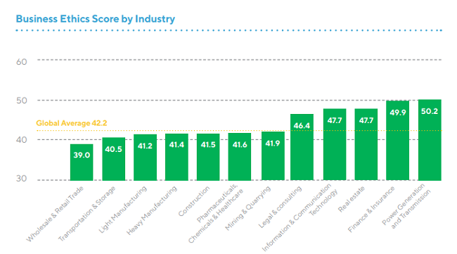 • La venta al por mayor, el transporte y el almacenamiento, la construcción y los sectores de manufactura ligera y pesada, todos se ubicaron por debajo del promedio mundial (42.2), lo que indica que estas industrias tienen un alto riesgo de corrupción, soborno y fraude.